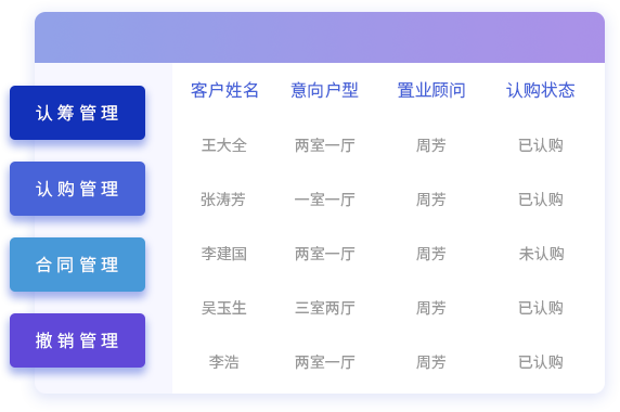 对楼盘交易过程中涉及到的各种交易业务,包括认筹、认购、合同、交房、撤销等,进行流程化,规范化管理,实时查询,实时管控。